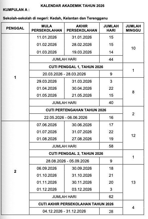 Bagi sekolah-sekolah di negeri kumpulan A, iaitu Kedah, Kelantan dan Terengganu, sesi persekolahan 2026 akan bermula pada 11 Januari 2026 iaitu pada hari ahad.