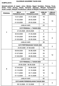 Bagi sekolah-sekolah di negeru kumpulan B pula, iaitu Johor, Melaka, Negeri Sembilan, Pahang, Perak, Perlis, Pulau Pinang, Sabah, Sarawak, Selangor, Wilayah Persekutuan Kuala Lumpur, Wilayah Persekutuan Labuan dan Wilayah Persekutuan Putrajaya, sesi persekolahan bermula pada 12 Januari 2026 iaitu pada hari Isnin.