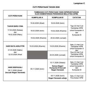 Untuk cuti sempena perayaan 2026, cuti diperuntukkan kepada 3 perayaan iaitu Tahun baru cina, Hari Raya Aidilfitri dan Hari Deepavali.